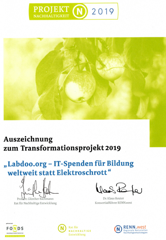 Transformationsprojekt des Jahres 2019, Auszeichnung durch den Rat für nachhaltige Entwicklung Deutschland und RENN.west